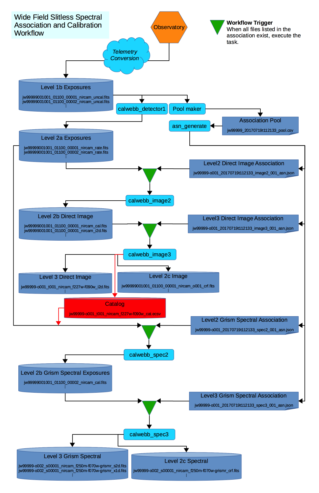 In most cases, the data will flow from Stage 2 to Stage 3, completing calibration. However, more complicated situations can be handled by the same wait-then-execute process. One particular case is for the Wide Field Slitless Spectrometry (WFSS) modes. The specific flow is show in the figure below: